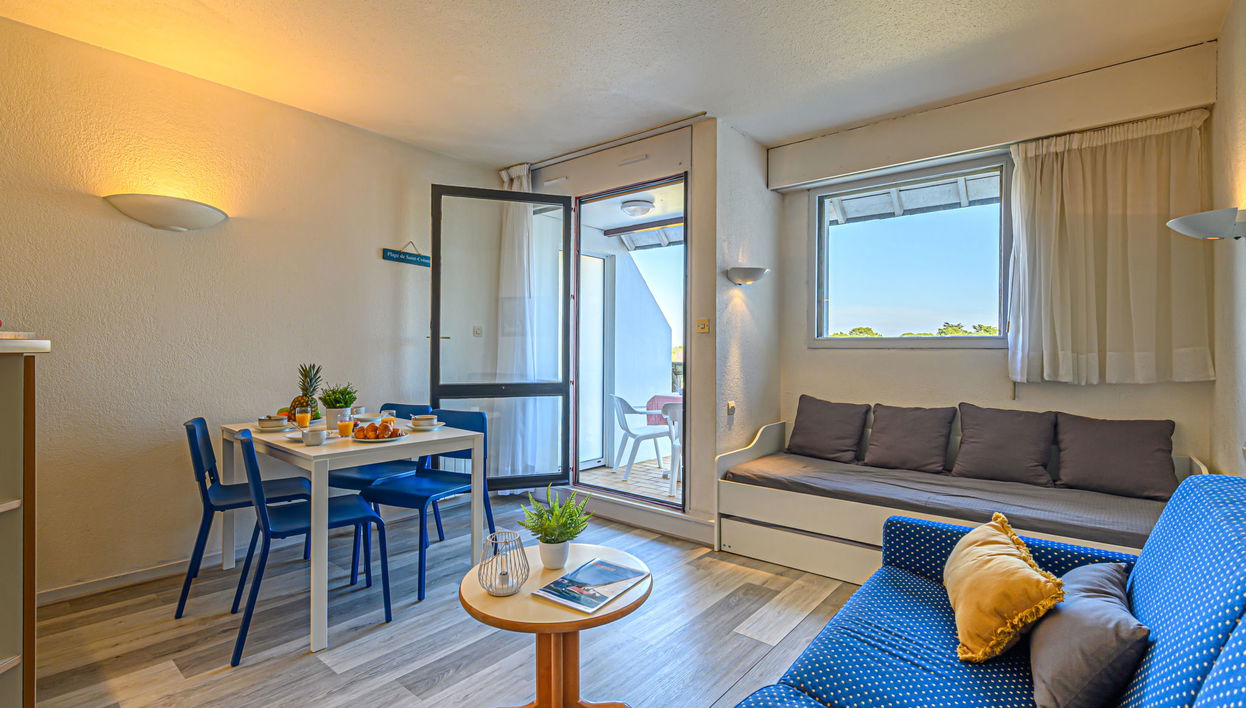 "Résidence Bleue Océane" estudio 25 m2 no 4° andar. Sala de estar/ sala de jantar com 1 sofá-cama duplo (1 x 140 cm, 190 cm de comprimento), 1 x 2 beliches (90 cm, 190 cm de comprimento), TV e ecrã plano.