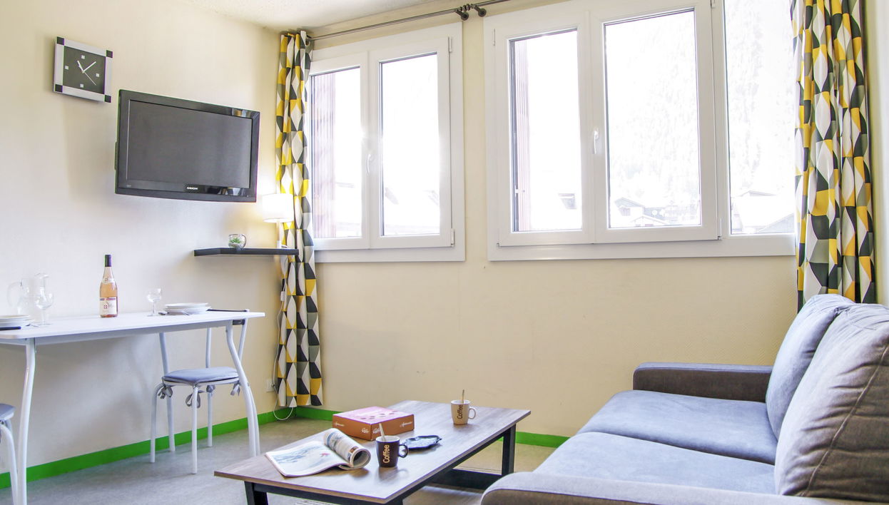 Estudio 19 m2 no 3° andar, sentido noroeste. Sala de estar/ sala de jantar com 1 sofá-cama duplo (160 cm, 200 cm de comprimento), TV. Kitchenette (fogão com 2 bicos, forno, chaleira, microondas, máquina de café eléctrica). Duche/WC. Calefação elétrica, aquecedor. Vista às montanhas. A moradia dispõe de: Internet (Sem fio/ Wireless LAN [WLAN], extra). Por favor, a ter em conta: sem estacionamento. TV somente FR. Alarme detector de fumaça. 740560007855H