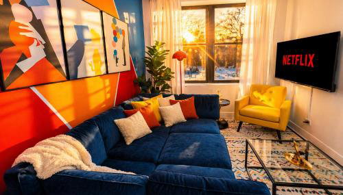 Este apartamento tem 1 quarto, cozinha com um frigorífico e uma máquina de lavar louça, uma televisão de ecrã plano, uma área de estar e 1 casa de banho dispondo de chuveiro.