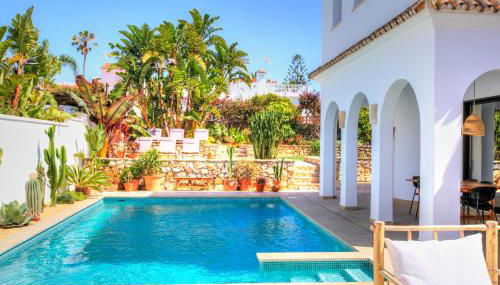 Apresentando uma piscina exterior, um jardim e um salão partilhado, Villa Mas Tranquila - A stylish villa with pool 150 m from the beach fornece acomodações em Conil de la Frontera com acesso Wi-Fi gratuito e vista do mar. O alojamento dispõe de estacionamento privado gratuito e uma cozinha partilhada.