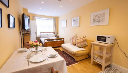 Este apartamento tem 1 quarto, uma sala de estar, uma kitchenette totalmente equipada com frigorífico e chaleira, e 1 casa de banho com chuveiro e produtos de higiene pessoal gratuitos. Toalhas e roupa de cama são providenciadas neste apartamento.
