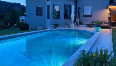 Apresentando uma piscina exterior sazonal, Souterrain-Ferienwohnung I 3-4 Pers I Garten & Gemeinschaftspool I Sachsenring apresenta acomodações em Hohenstein-Ernstthal com acesso Wi-Fi gratuito vista da cidade.