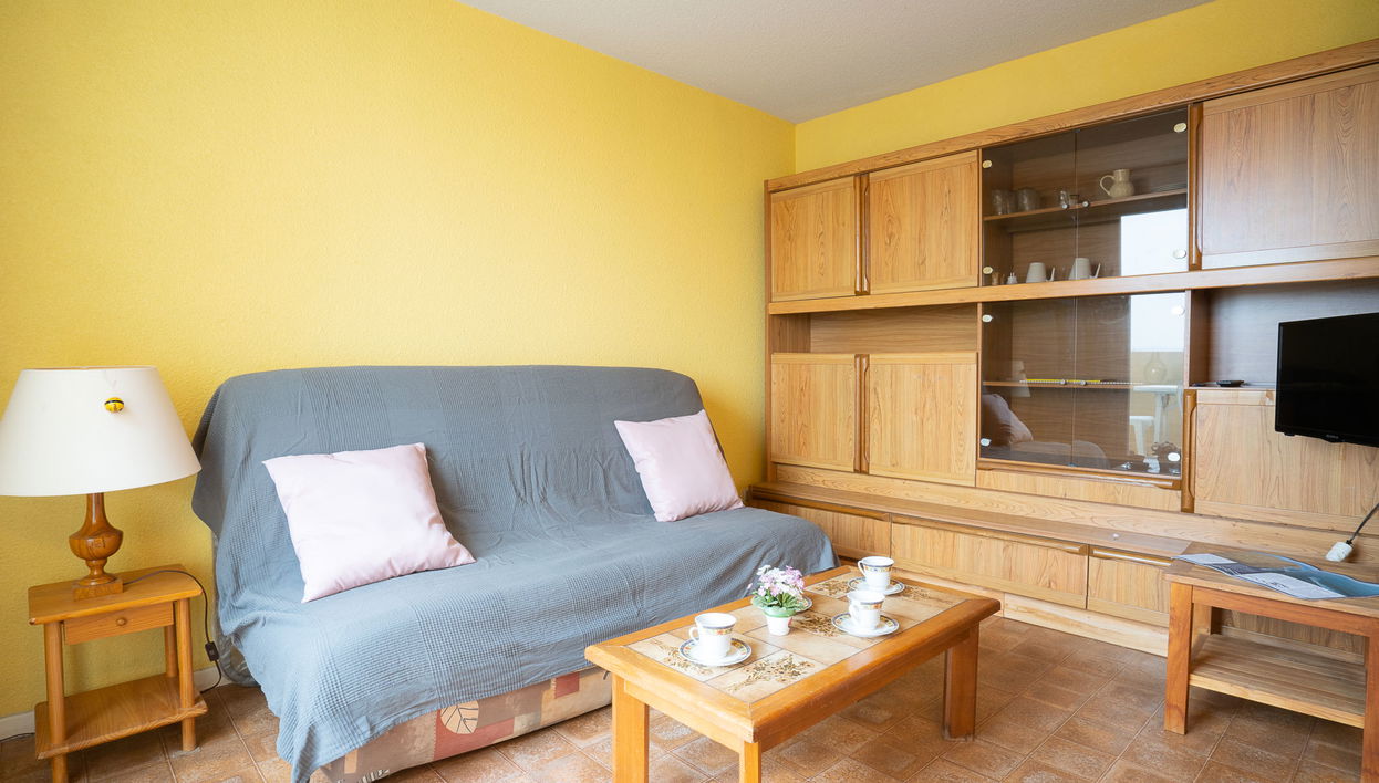 Apartamento de 2 assoalhadas 30 m2 no 4° andar. Sala de estar/ sala de jantar com TV. 1 quarto com 1 cama de casal (140 cm, 190 cm de comprimento). Hall de entrada com 1 x 2 beliches (80 cm, 185 cm de comprimento). Kitchenette (3 placas de vitrocerâmica, microondas com grill). Duche/WC. Terraço 4 m2, sentido leste. Móveis de terraço. A moradia dispõe de: Internet (Sem fio/ Wireless LAN [WLAN], extra). Vaga de estacionamento. Por favor, a ter em conta: estacionamento para carros pequenos. Permitido no máximo 1 animal de estimação/ cão. Alarme detector de fumaça. 30133000849 6C