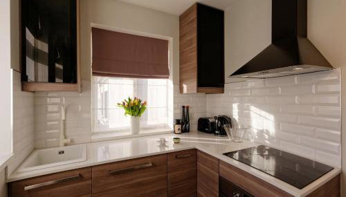 Este apartamento tem uma sala de estar e uma cozinha totalmente equipada com frigorífico e forno.