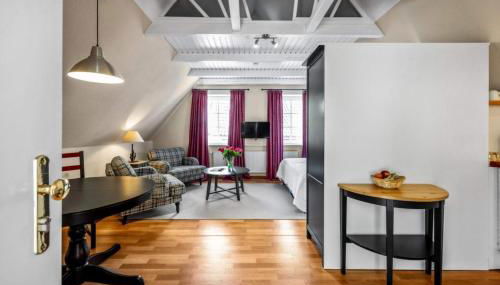 A kitchenette dispõe de um frigorífico, uma placa de fogão e uma torradeira, assim como máquina de café e chaleira.