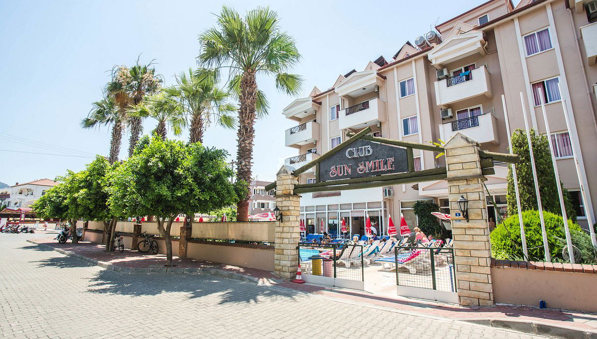 The Sunsmile is located 3 km to the Marmaris city centre and 1,5 km. to the nearest beach. Furthermore, the hotel enjoys a very dynamic atmosphere within various restaurants, bars and shopping centre. A local bus service runs from the main road nearby to the resort centre and to the beach. The hotel services and facilities include: 24 hours front desk, lobby, lift, exchange money, hire safety box, internet corner, restaurant, bar with TV on big screen, swimming pool, pool bar, garden, as well as billiard and darts. The apartments are equipped with air conditioning (charged locally), telephone, fridge, bathroom with shower and hair dryer, balcony, as well as all kitchen equipment with kettle, toaster and fridge.