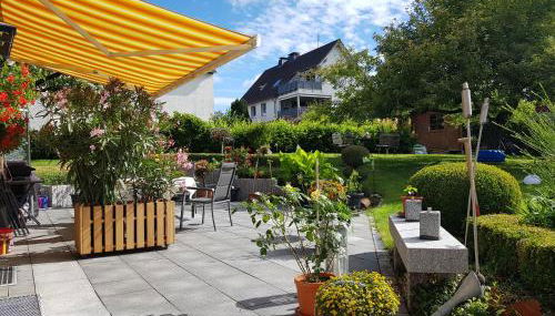 Apresentando bicicletas gratuitas, um jardim e um terraço, Hedasis Ferienwohnung mit Garten, 500 m vom Möhnesee - ruhig & modern apresenta acomodações em Möhnesee com acesso Wi-Fi gratuito e vista do jardim.