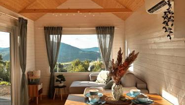 Este chalé com ar condicionado tem 1 quarto, uma sala de estar, uma kitchenette totalmente equipada com frigorífico e chaleira, e 1 casa de banho com chuveiro. Toalhas e roupa de cama são providenciadas neste chalé.