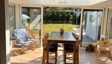 Esta casa de férias com um terraço e vista do jardim tem 2 quartos, uma sala de estar, uma televisão de ecrã plano, uma cozinha equipada com frigorífico e forno, e 1 casa de banho com chuveiro.