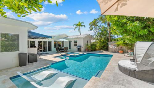 Apresentando uma piscina exterior, um jardim e um terraço, Across from Beach- 3 Master Suites, Heated Pool & Spa, Tanning Ledge, Golden Tee - by Maven Vacation Rentals fornece acomodações em West Palm Beach com acesso Wi-Fi gratuito e vista da cidade. Situado a 3 minutos a pé de Praia Riviera, o alojamento apresenta um bar e estacionamento privado gratuito.