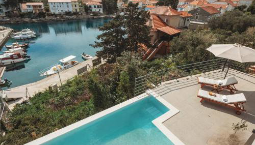 Em Božava, SOL luxury residence near the beach with shared heated pool apresenta acomodações com acesso Wi-Fi gratuito, ar condicionado e acesso a um jardim com uma piscina exterior.