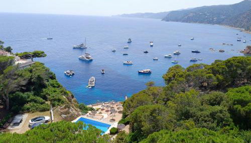Top Lage mit privater Bucht situa-se em Sant Feliu de Guixols e fornece uma piscina privada e acesso Wi-Fi gratuito. Situado a 6 minutos a pé de Platja Port Salvi, o alojamento dispõe de um terraço e estacionamento privado gratuito.