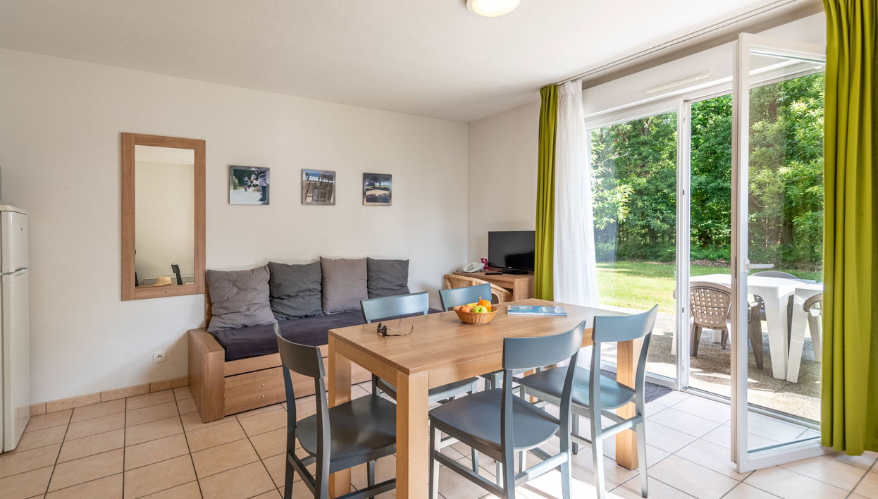 "Cottage Confort 5 Pers.", casa geminada 2 assoalhadas 39 m2. Com mobiliário funcional: sala de estar/ sala de jantar com 1 sofá-cama (80 cm, 190 cm de comprimento), 1 cama de puxar (2 pers.