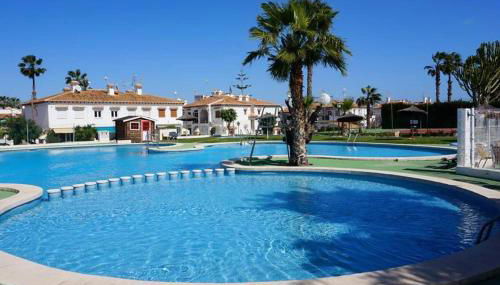 Apresentando uma piscina exterior, um terraço e um restaurante, Costa Blanca Bungalow Lago jardin frente piscina 4 personas #PRP001 by Stay Orihuela Costa fornece acomodações em Torrevieja com acesso Wi-Fi gratuito e vista da piscina.