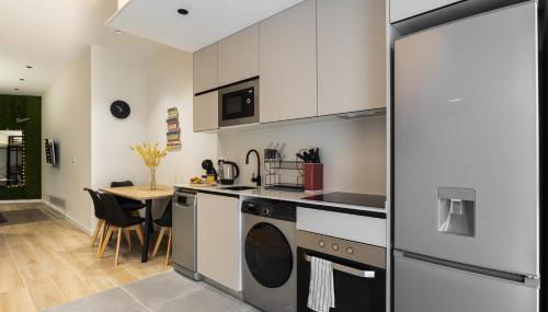 Este apartamento com ar condicionado tem 1 quarto, uma sala de estar, uma cozinha totalmente equipada com máquina de lavar louça e máquina de café, e 1 casa de banho com banheira e produtos de higiene pessoal gratuitos.