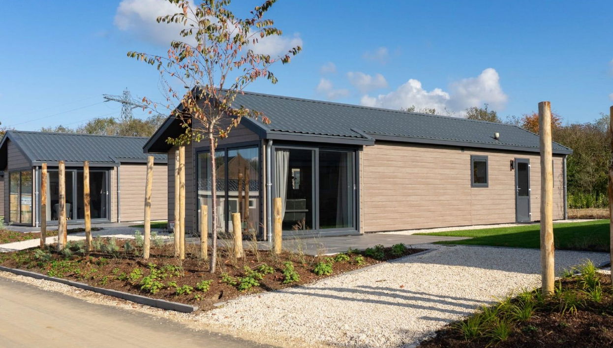 "Velthorst 6", chalé de madeira 4 assoalhadas 70 m2. Com mobiliário confortável: hall de entrada. Sala de estar/ sala de jantar com mesa de jantar e ecrã plano, saída ao terraço. 2 dorm. duplos, cada quarto com 2 camas. 1 dorm.